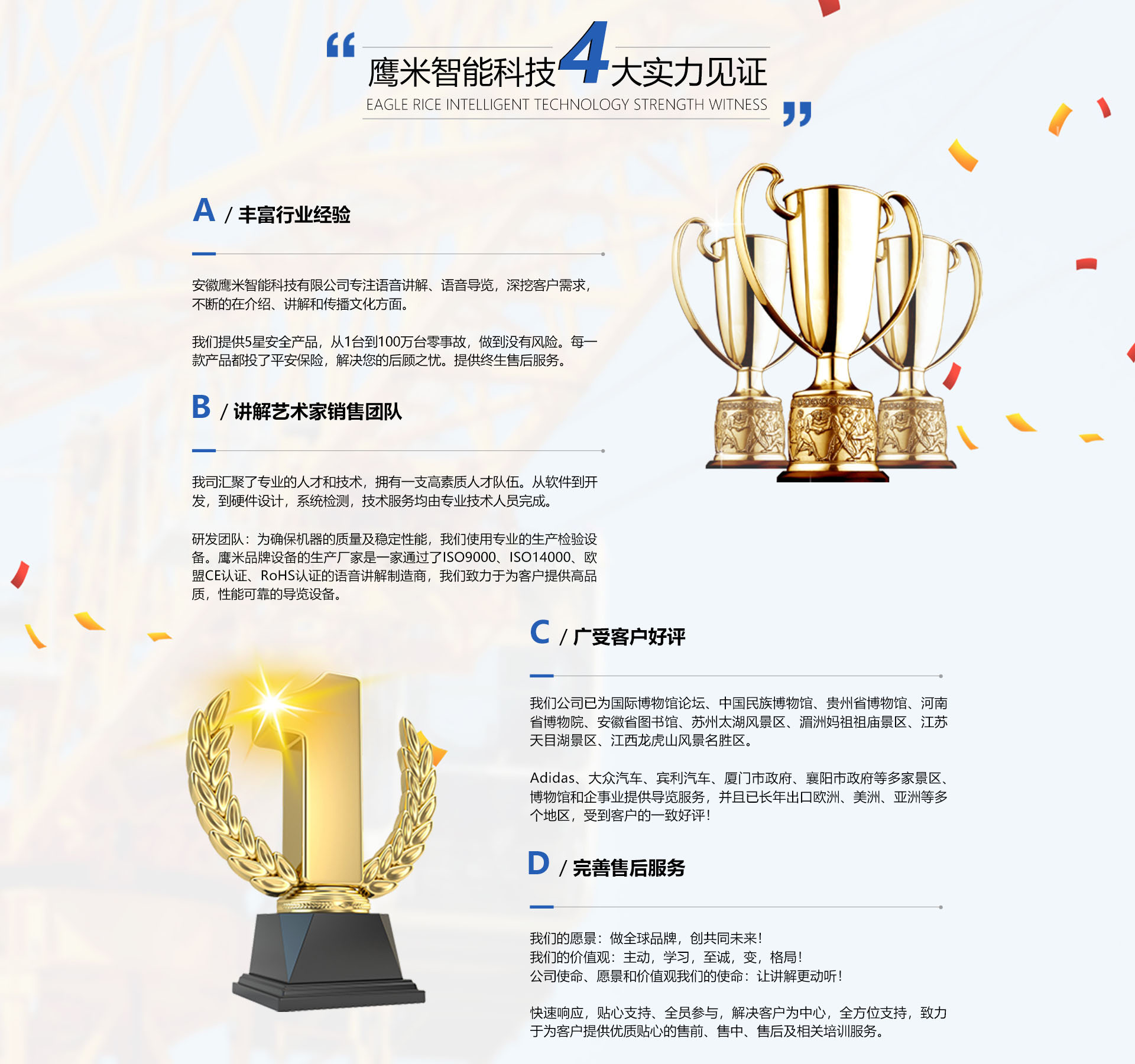 一、 公司簡(jiǎn)介 安徽鷹米智能科技有限公司是專(zhuān)注開(kāi)發(fā)、生產(chǎn)語(yǔ)音講解設(shè)備和系統(tǒng)的企業(yè),公司地址位于安徽省合肥市(蜀山區(qū))高新區(qū)星夢(mèng)園。鷹米語(yǔ)音導(dǎo)覽專(zhuān)注于智能語(yǔ)音講解設(shè)備和系統(tǒng)的研發(fā)、生產(chǎn)、銷(xiāo)售,涵蓋了旅游導(dǎo)覽的信息化建設(shè),我們已經(jīng)為國(guó)內(nèi)的國(guó)際博物館論壇、中國(guó)民族博物館、河南省博物院、安徽省圖書(shū)館以及中國(guó)黃金博物館、蘇州太湖風(fēng)景區(qū)、湄洲媽祖祖廟景區(qū)、江蘇天目湖景區(qū)(國(guó)家5A景區(qū))、江西龍虎山風(fēng)景名勝區(qū)(5A、中國(guó)第八處世界自...